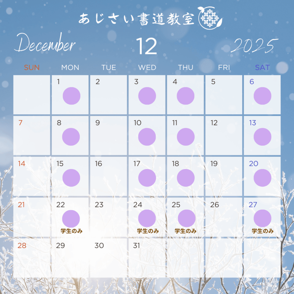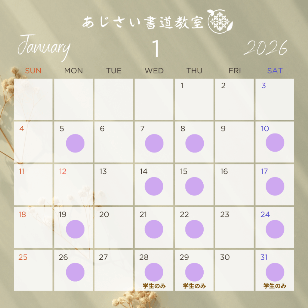 あじさい書道教室では、2025年12月・2026年1月の稽古予定を以下のカレンダーにてご案内しております。