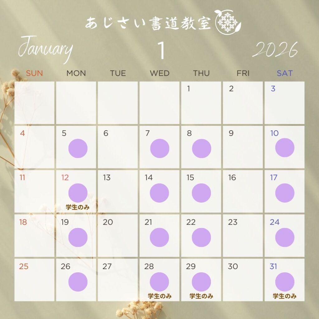 あじさい書道教室では、2025年12月・2026年1月の稽古予定を以下のカレンダーにてご案内しております。